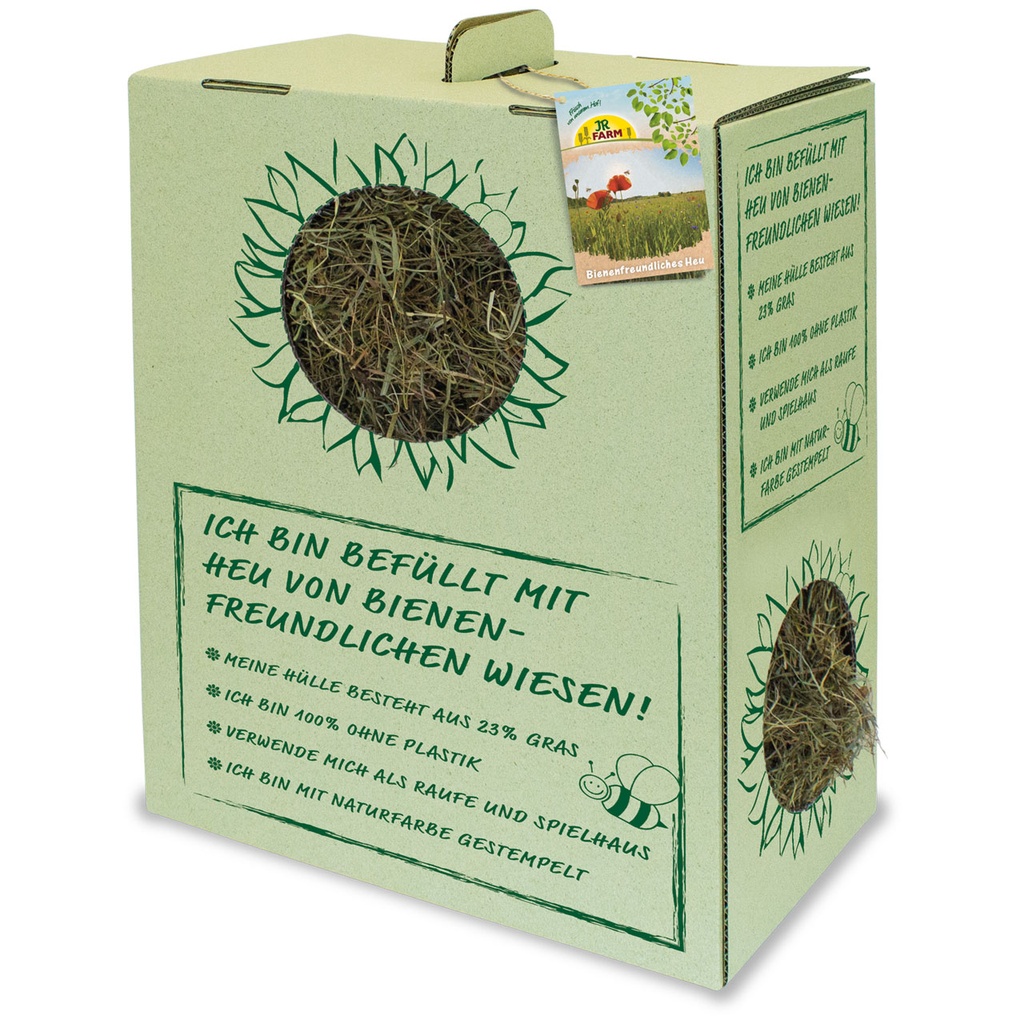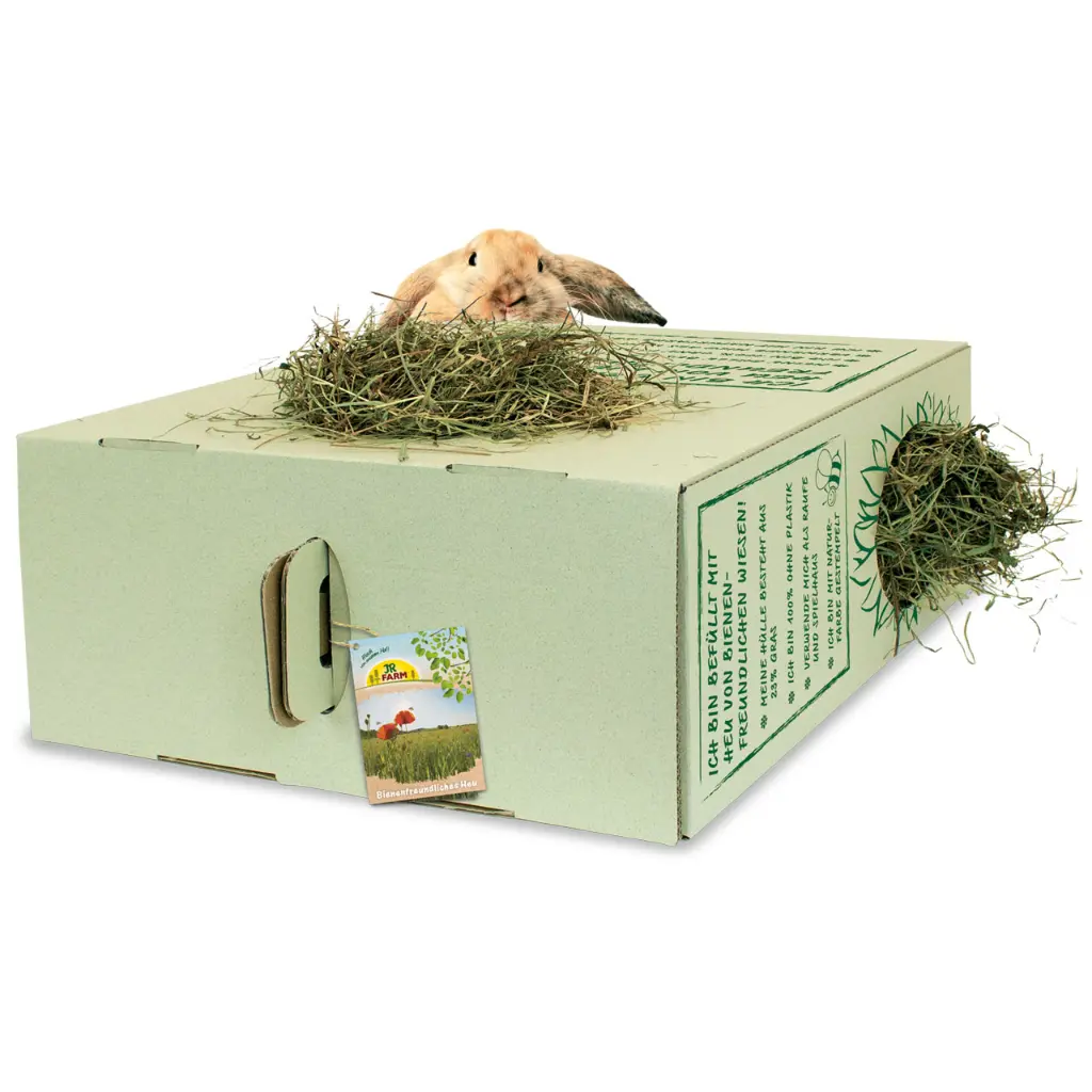 JR FARM bee-friendly hay is packed 100% plastic-free and the grass carton (consists of 30% grass) has a natural green colour. The pre-cut holes can be easily cut out and the carton can immediately be used as a hay rack or a playhouse that can be nibbled on without hesitation.